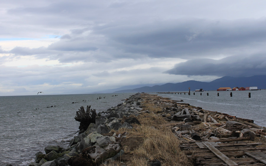Go past the sewage treatment plant (yeah, I know, weird eh?) and the Iona Spit Trail, park in the generous lot at the end of the road. The wild life preserve is on the right but walk through the washroom breeze-way and you come out into a wild and wooly beach that would not be out of place on the west coast of Vancouver Island. The slight finger of land juts out with the ocean on one side and the estuary of the Fraser on the other. The center is raised sand bluffs with scrub cover which hides a dumping ground for semi-trailers and the other side of the finger is used for log booms all of which adds to the gritty ambiance.