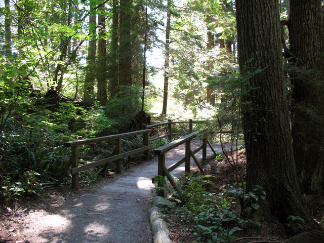 But not you, no you know that just off the wall is a wondrous secret world of trees and moss and cool moist air that will ease your sunburn and calm your nerves. The light is softened as it filters down through the trees, creating spotlights to show-off the many treasures of this world. Ferns, mushrooms, Douglas fir, Western Red cedar, Western Hemlock, and Sitka Spruce trees abound. Especially ferns, moving in the still air causing you to look for a passing fairy.