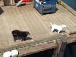 - White and black dogs on the docks, who knew it was a thing, happening on every dock we stopped at.